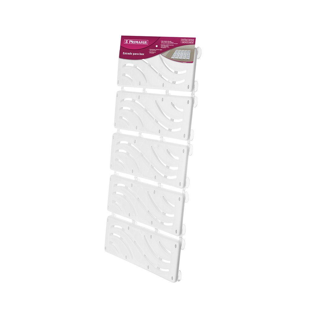 Estrado para box de plástico polipropileno (PP). Fixação com ventosas de PVC. Ótima aderência. Vazado para não acumular água nem sujeira. Ideal para áreas úmidas.