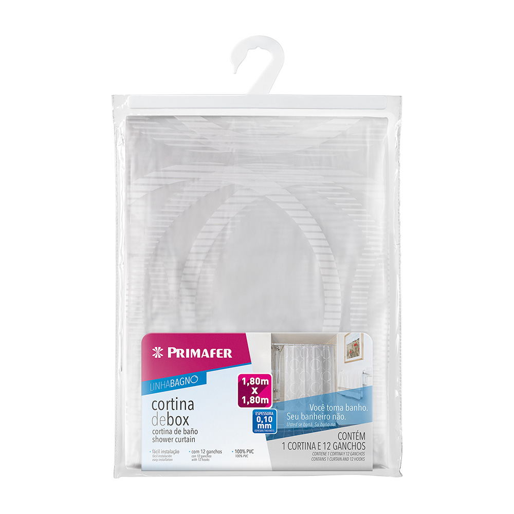 Cortina plástica de PEVA, com fixação do tipo argola e 1,80x1,80m. Material impermeável e resistente ao bolor, ideal para box ou banheira. Produto com maior espessura de 0,10mm e 12 ganchos, muito fácil de instalar. Lavagem deve ser feita à mão, sem abrasivos. Não alvejar. Ideal para consumidores exigentes que procuram produto de alta qualidade, resistente, fácil de limpar e com design moderno.