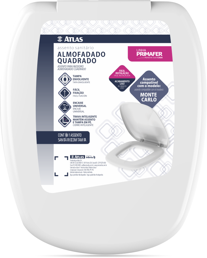 Assento sanitário almofadado. Acompanha kit para fixação. Compatível com as louças monte carlo. Preenchido com espuma de poliuretano (PU), ultra macio. Acabamento liso. Tampa envolvente. Suspiro na parte traseira. Fácil de instalar e limpar.