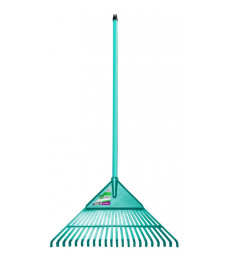 Vassoura plástico com cabo de madeira e 26 dentes. Resistente e prática. Ideal para recolher a grama cortada, folhas e outros detritos presentes no gramado.