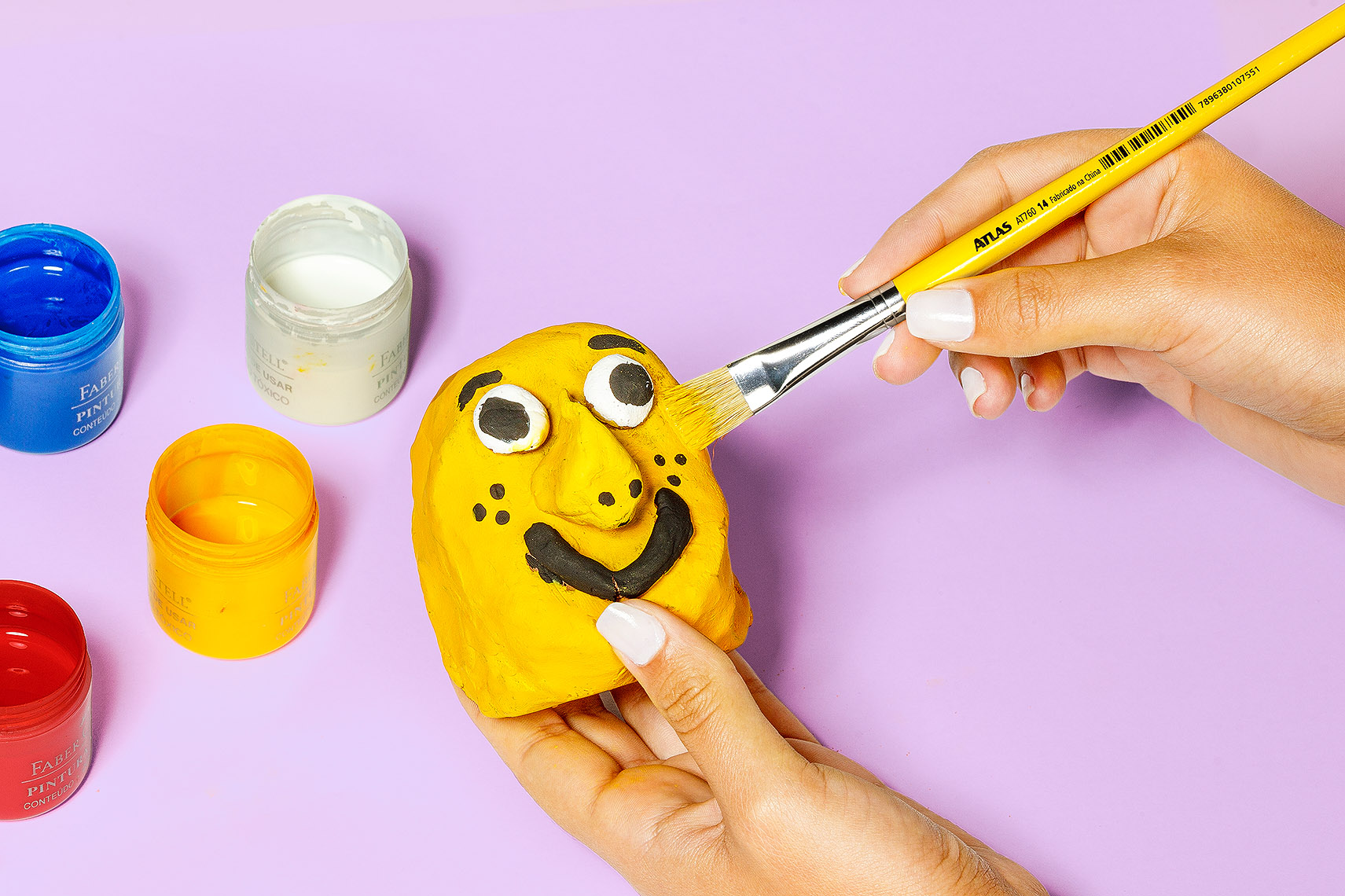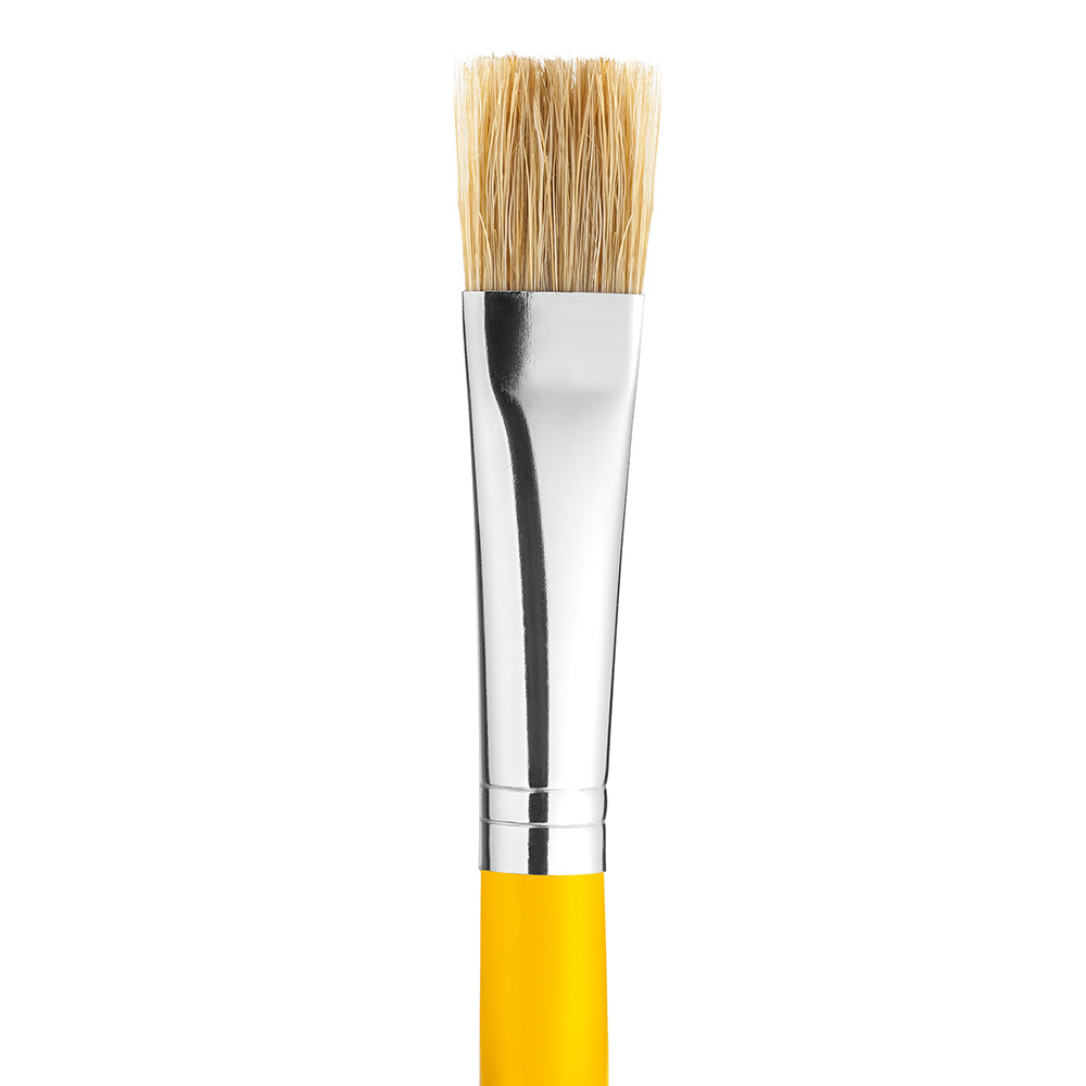 Pincel escolar achatado - cerdas suínas brancas, cabo plástico cor amarela. Pincel indicado para pintura escolar em geral.