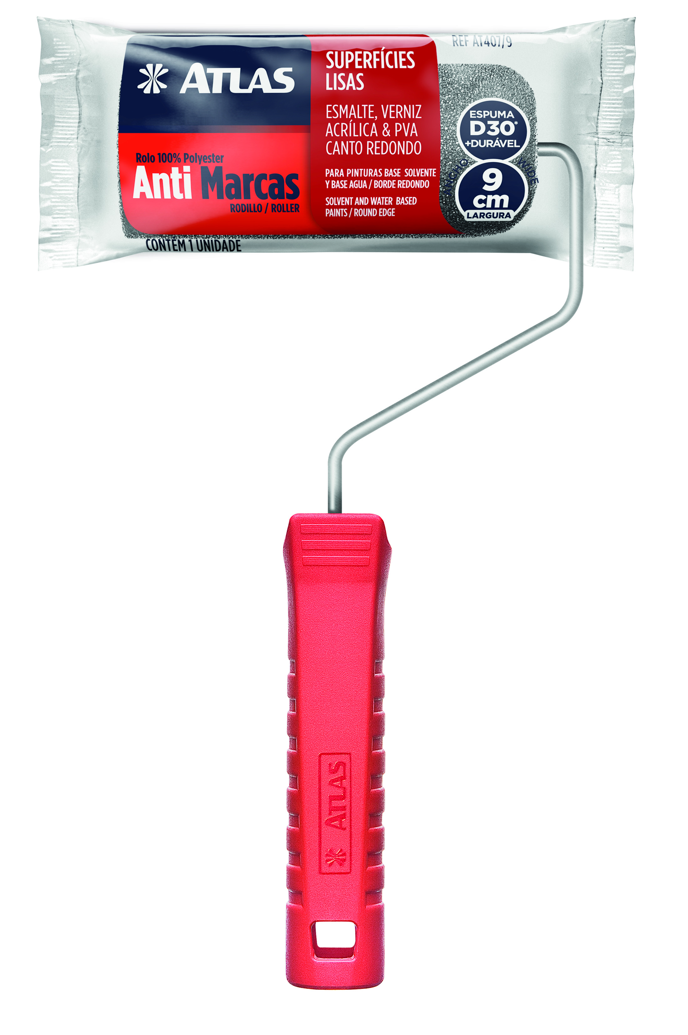 Rolo de espuma 100% poliéster e com densidade 30 (kg/m³) com 23cm e cantos arredondados. Resistentes a solventes. Indicado para superfícies lisas. Os cantos arredondados fazem com que as marcas deixadas pelo rolo se reduzam drasticamente. Ideal para tintas esmalte, verniz, acrílica (pva). Produto resistente a solventes minerais, não utilizar com thinner.