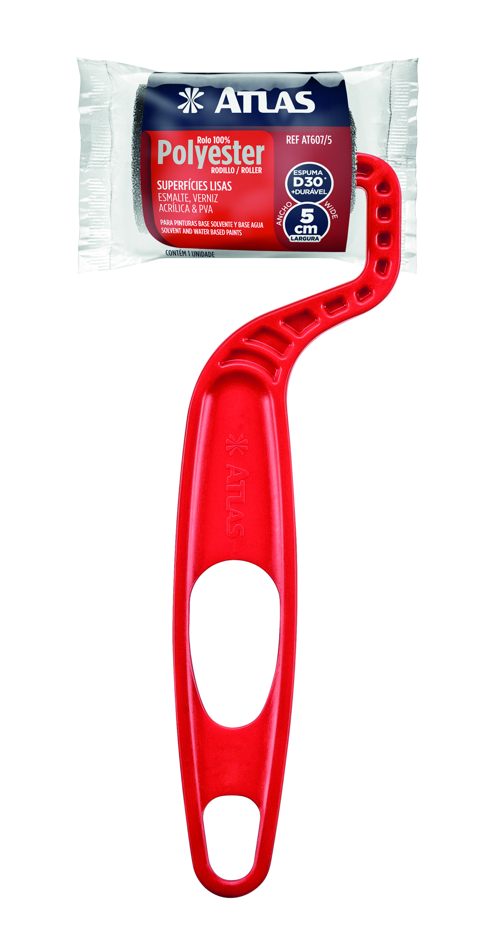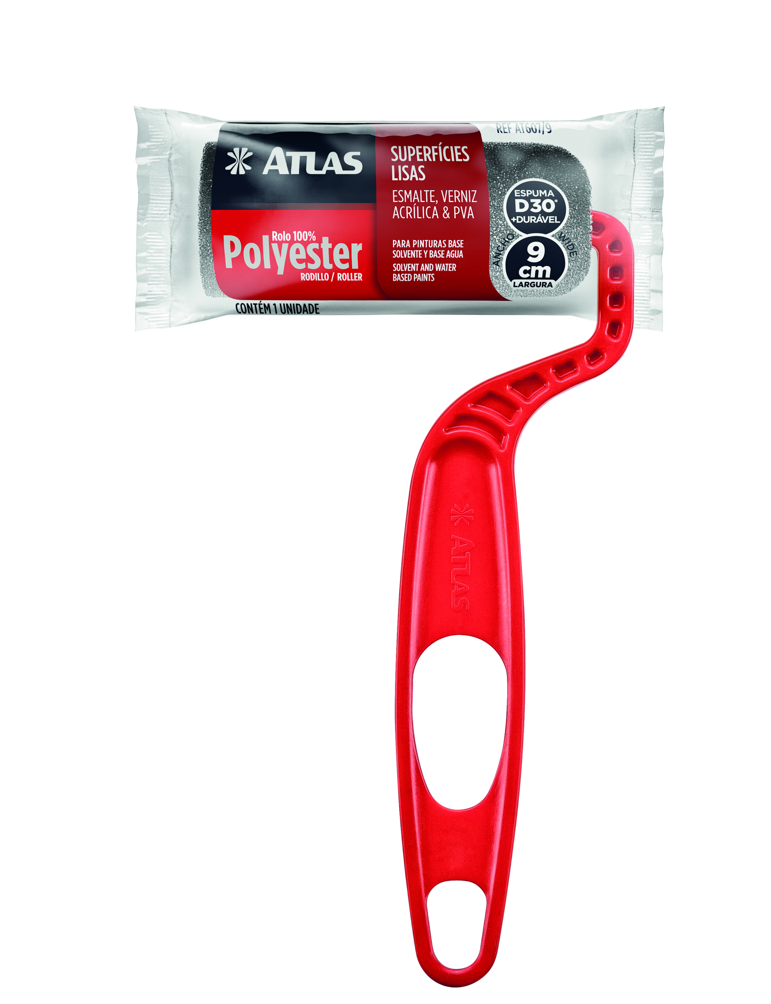 Rolo de poliéster com cabo plástico. Densidade 30 (kg/m³). Resistente a solventes. Indicado para superfícies lisas. Use com tintas esmalte, verniz, acrílica (pva). Produto resistente a solventes minerais, não utilizar com thinner.