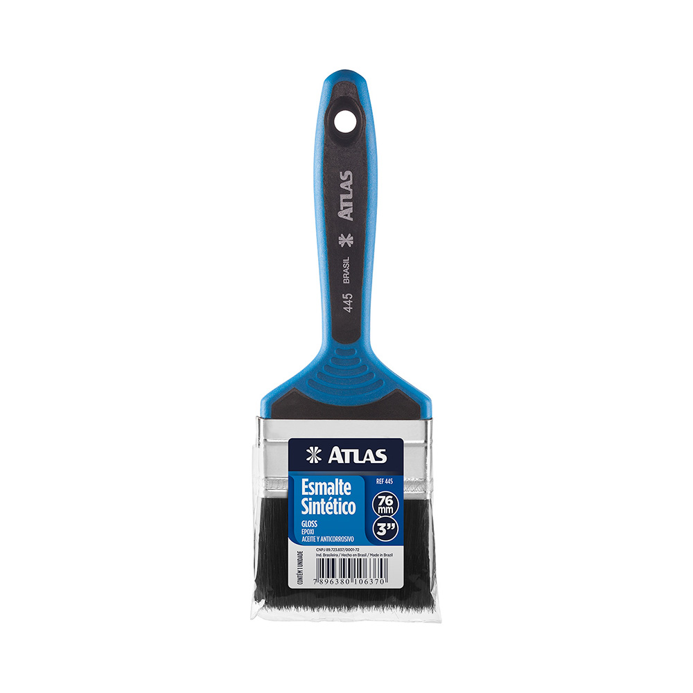 Trincha dupla de cerdas pretas longas. Boa capacidade de retenção de tinta. Rendimento e cobertura do filme ideal para tintas esmalte sintético e base água.